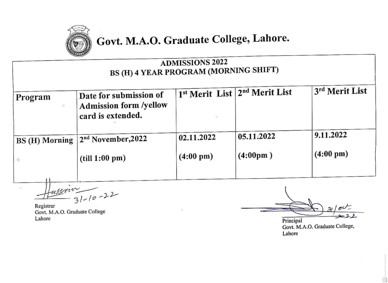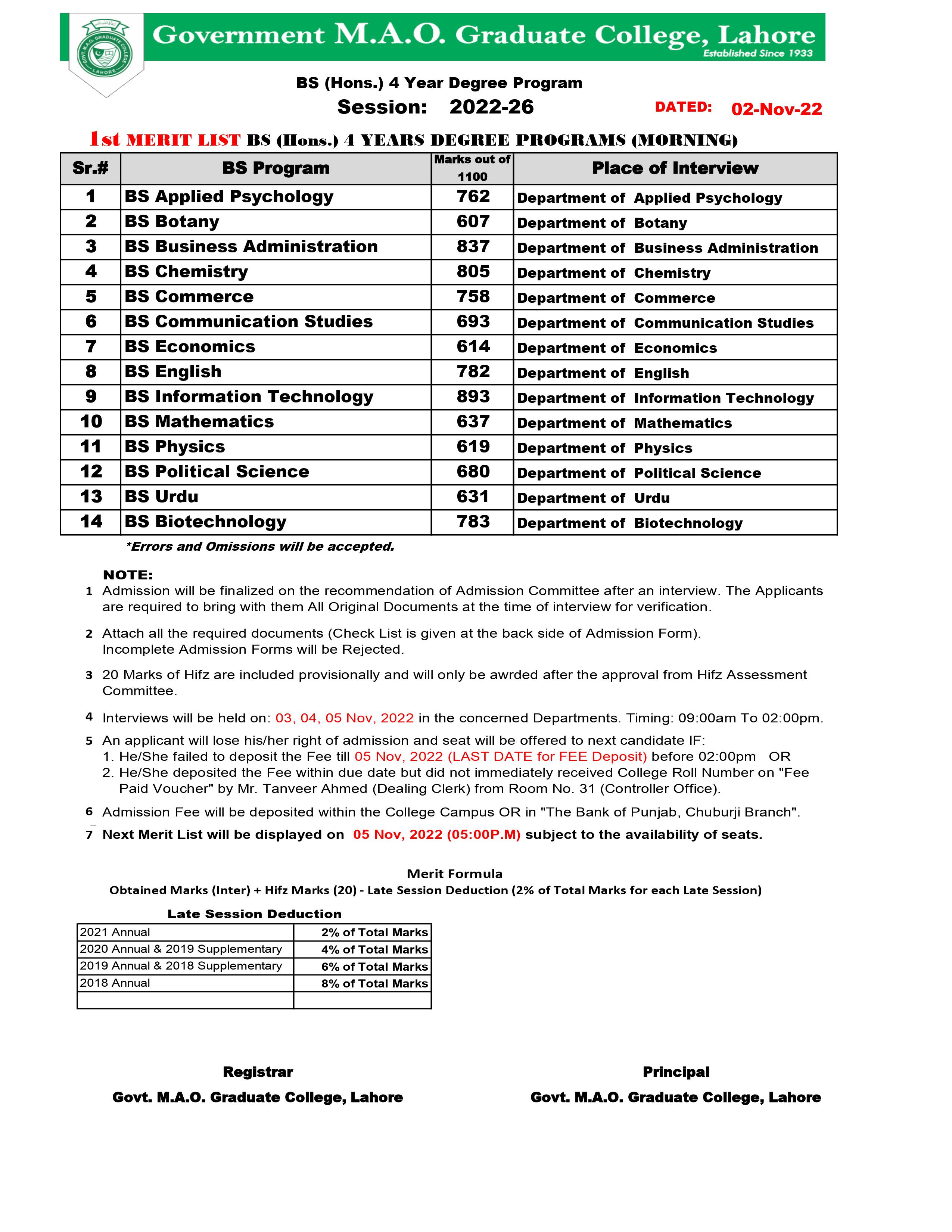1st Merit List BS (Hons) (Morning)