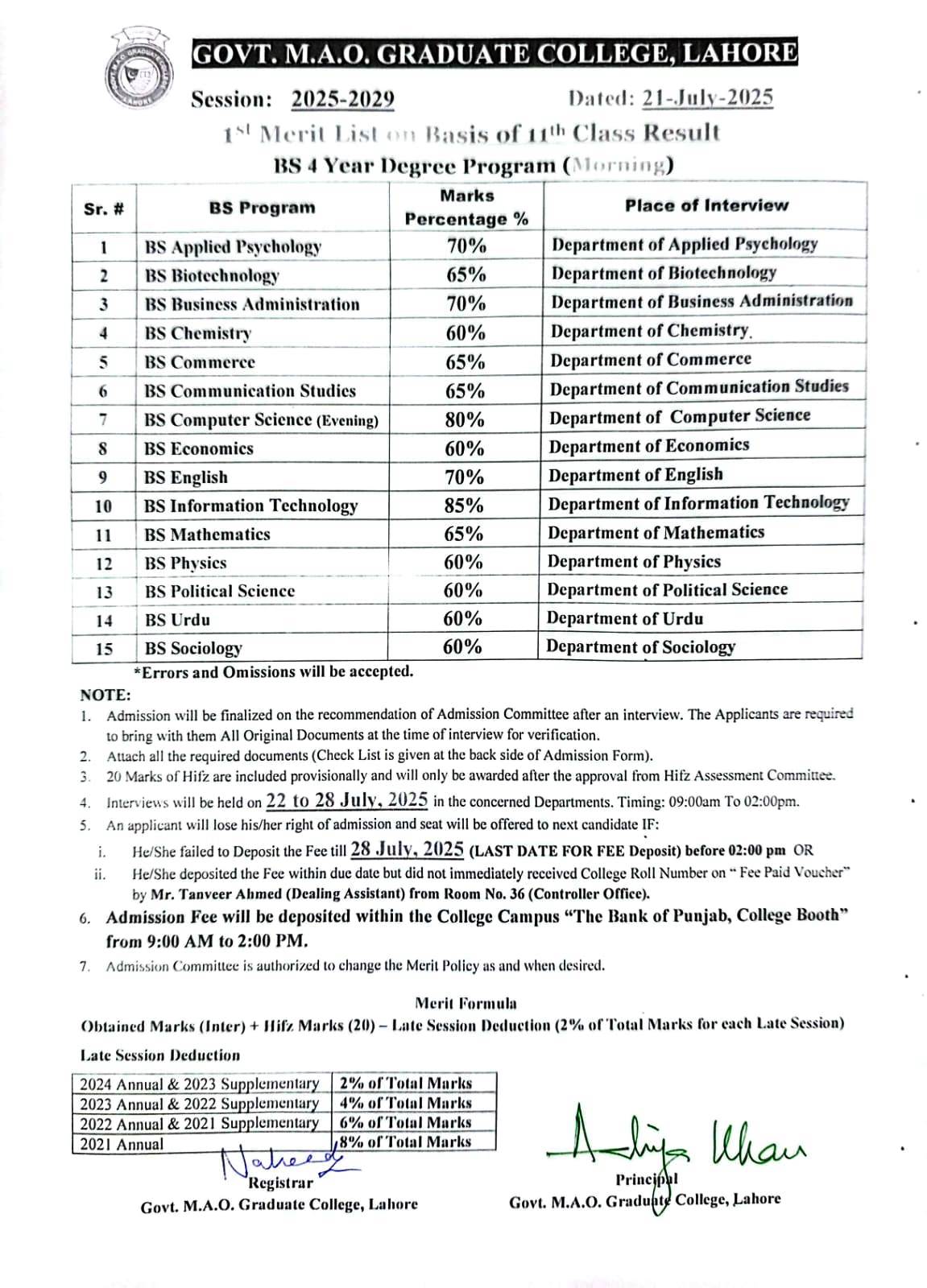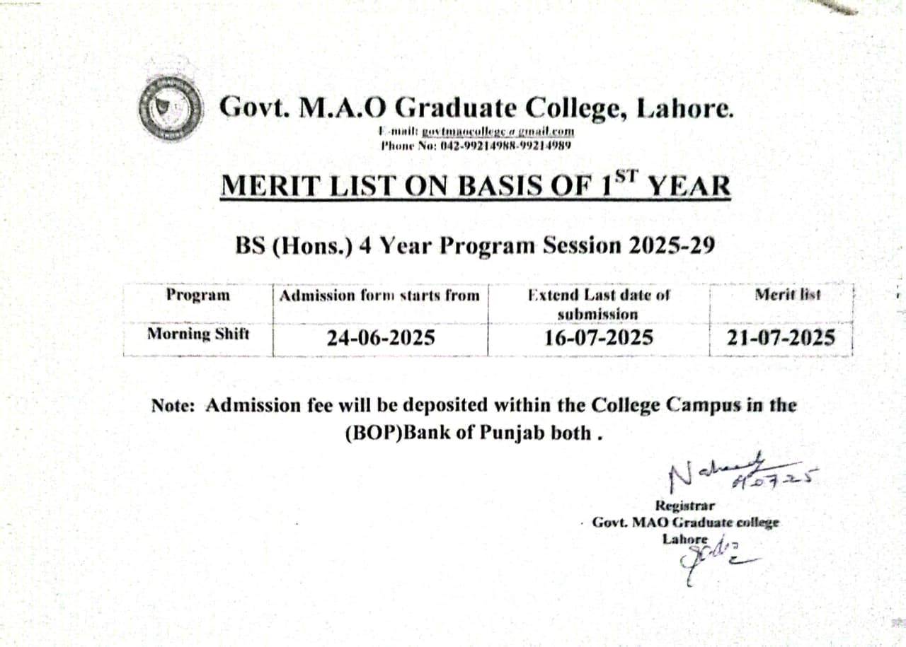 1st Merit List of BS Four Year Program 2025 on the Basis of 11th Class Result