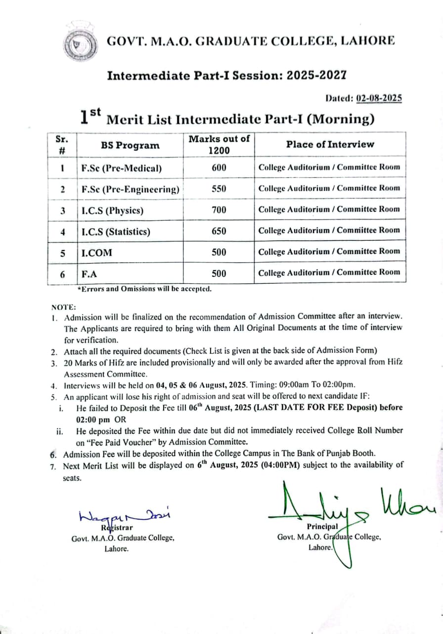 Intermediate 1st Merit List 2025