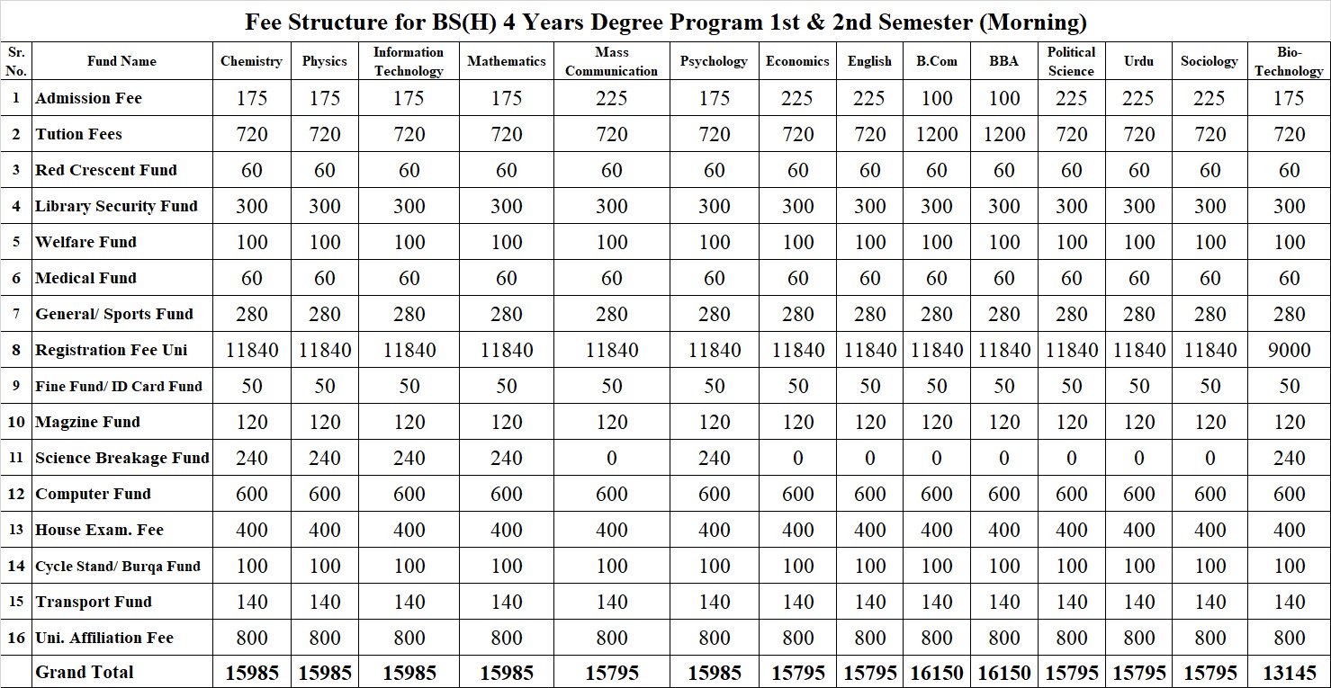BS Fee Structure 1st & 2nd Semester (Morning)