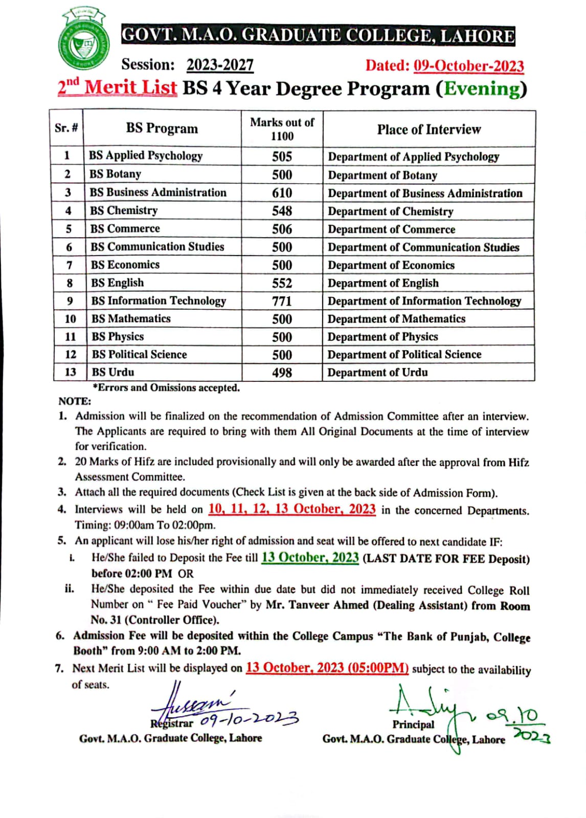 2nd Merit List of BS (Hons) (Evening) 2023