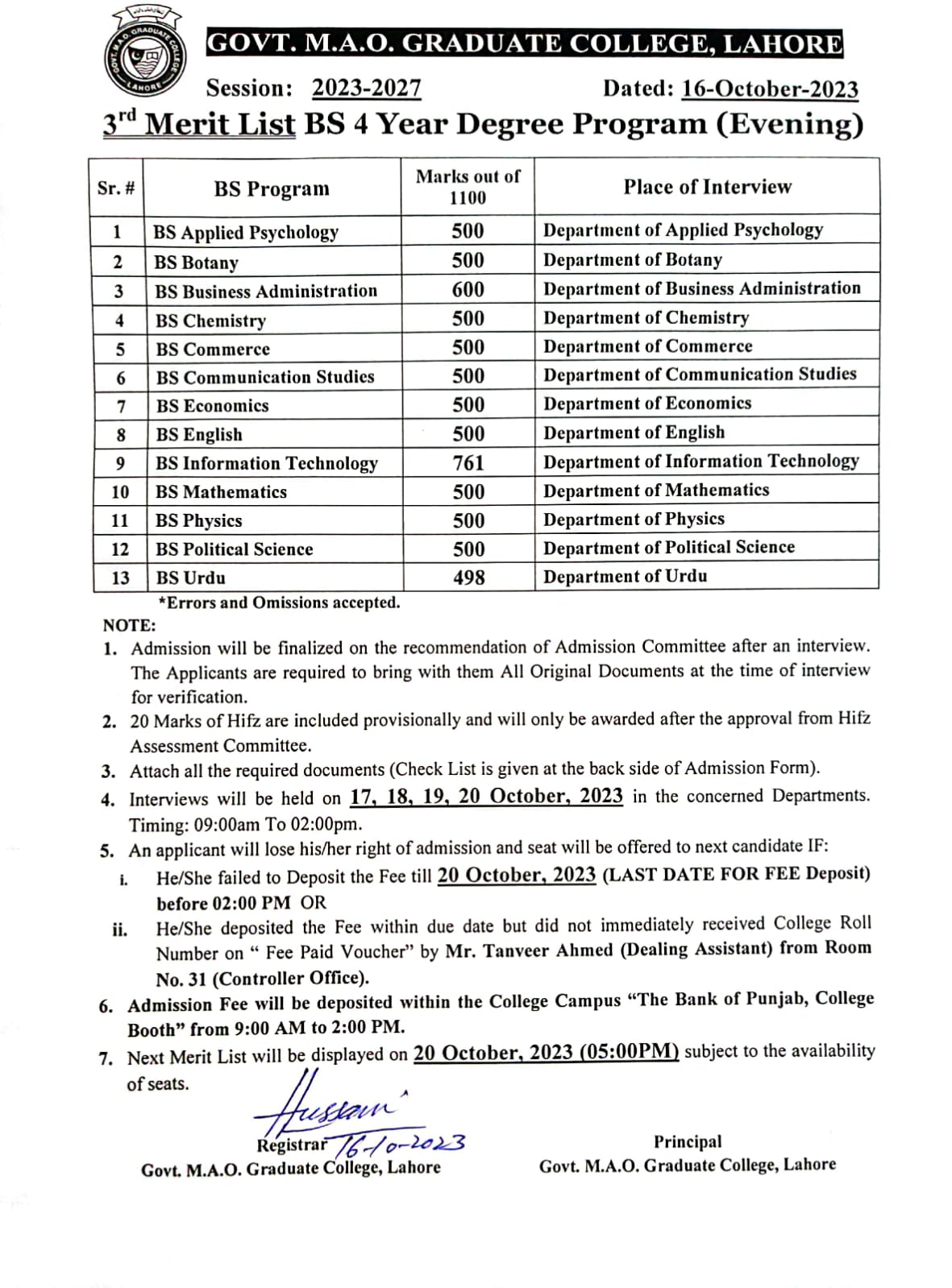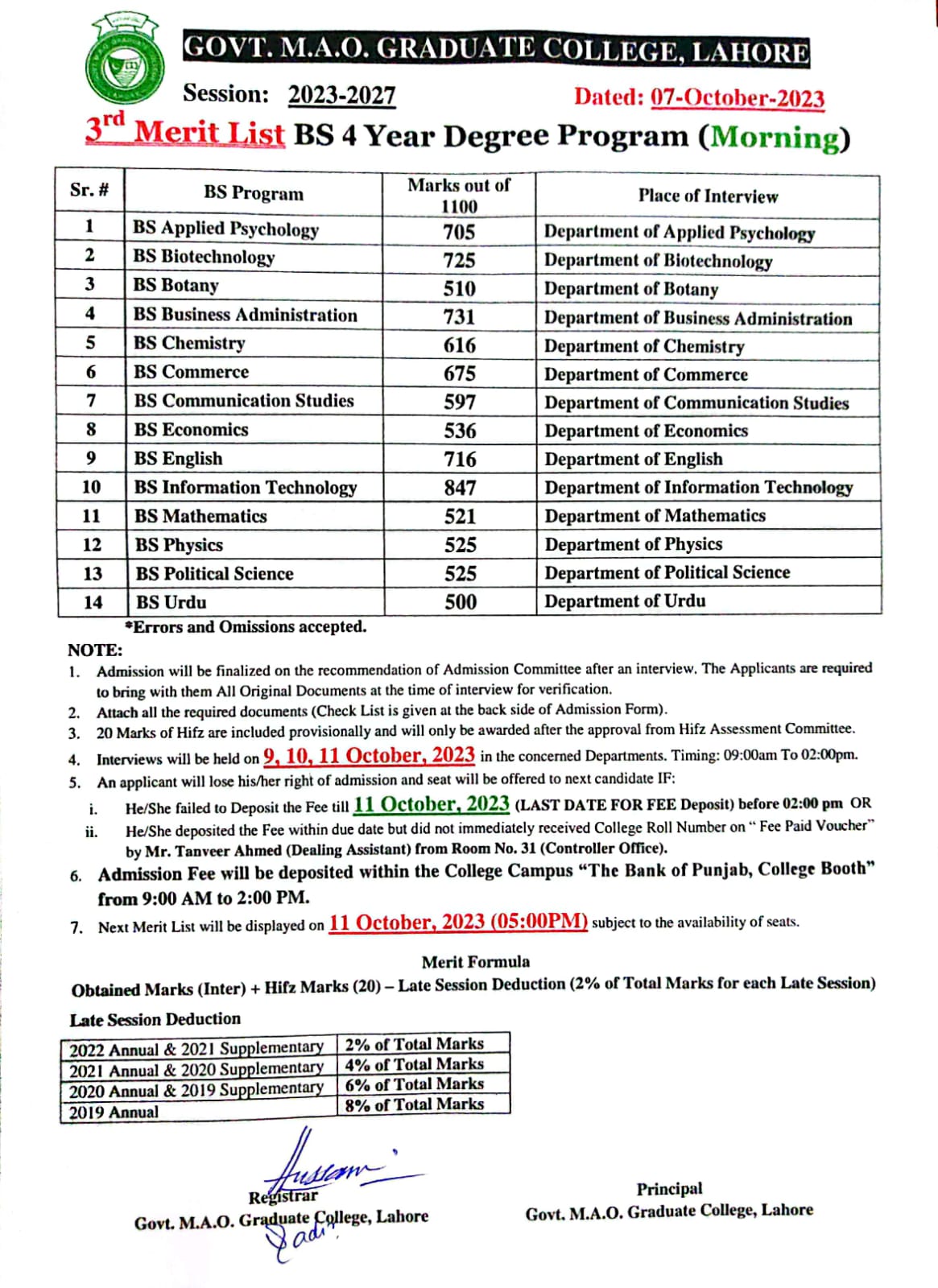3rd Merit List of BS (Hons) (Morning) 2023