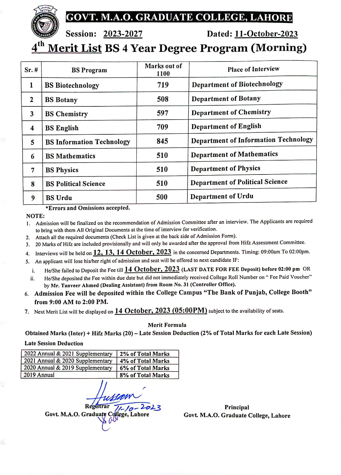 4th Merit List of BS (Hons) (Morning) 2023