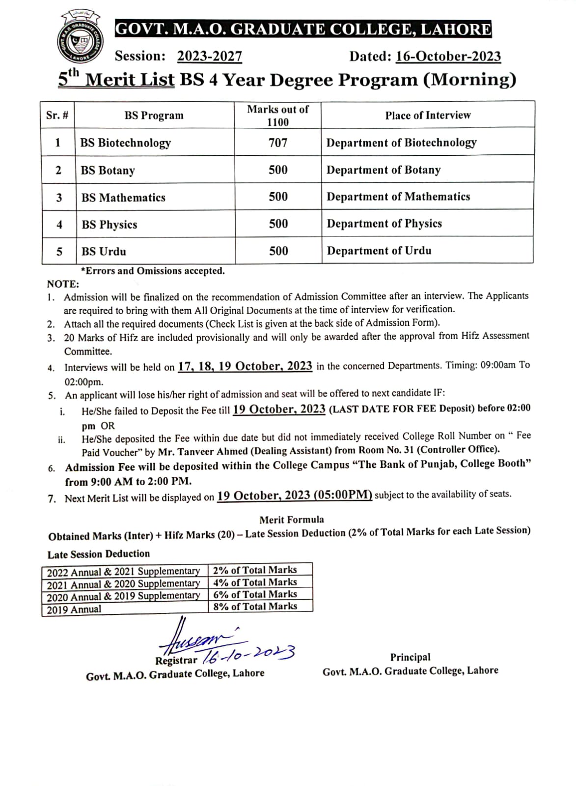 5th Merit of BS (Hons) (Morning) 2023