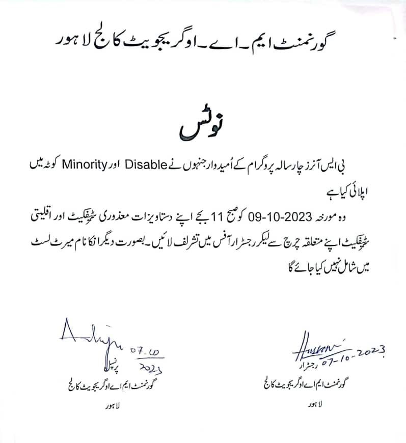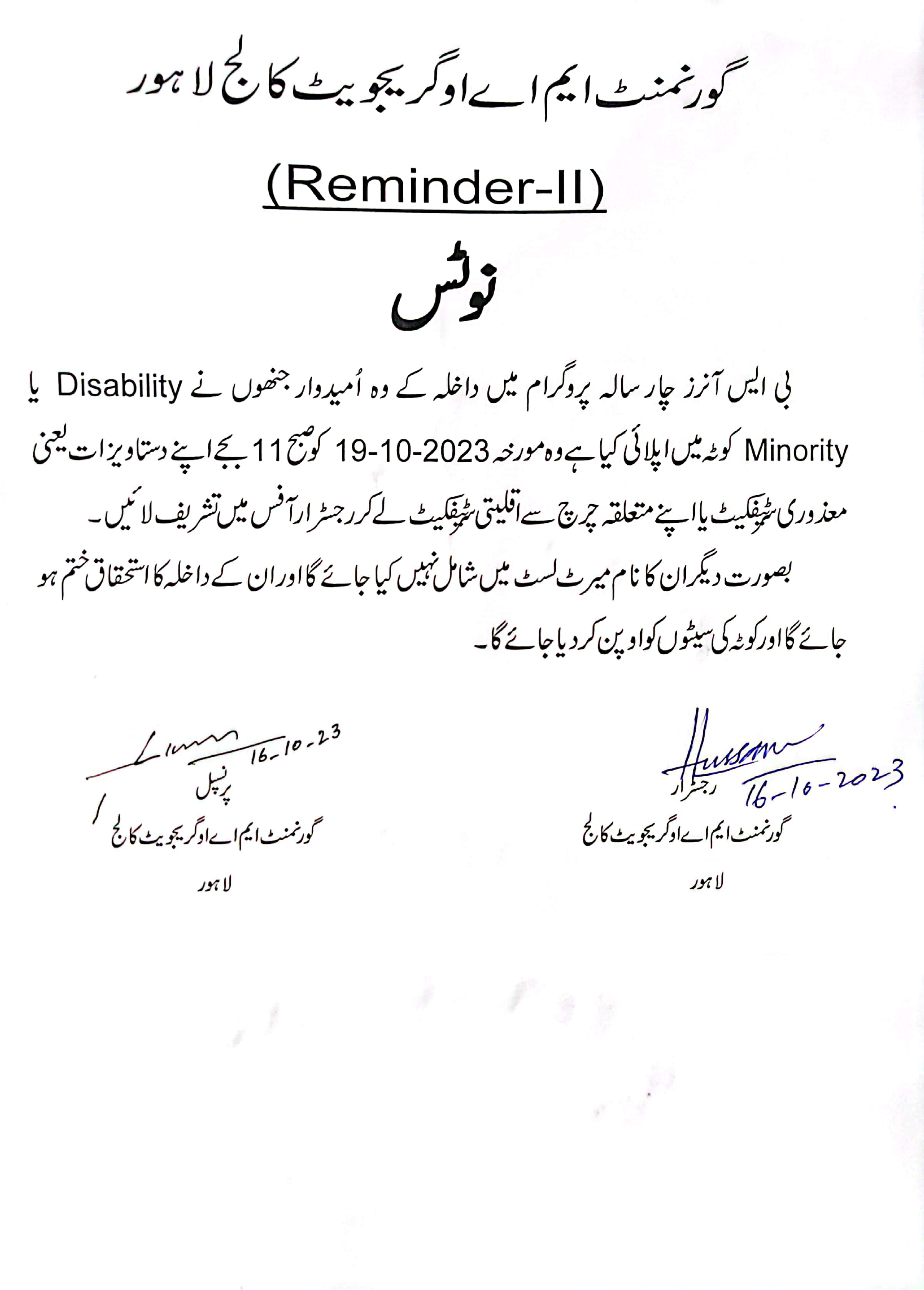 Notice for Disable & Minority Quota 2023