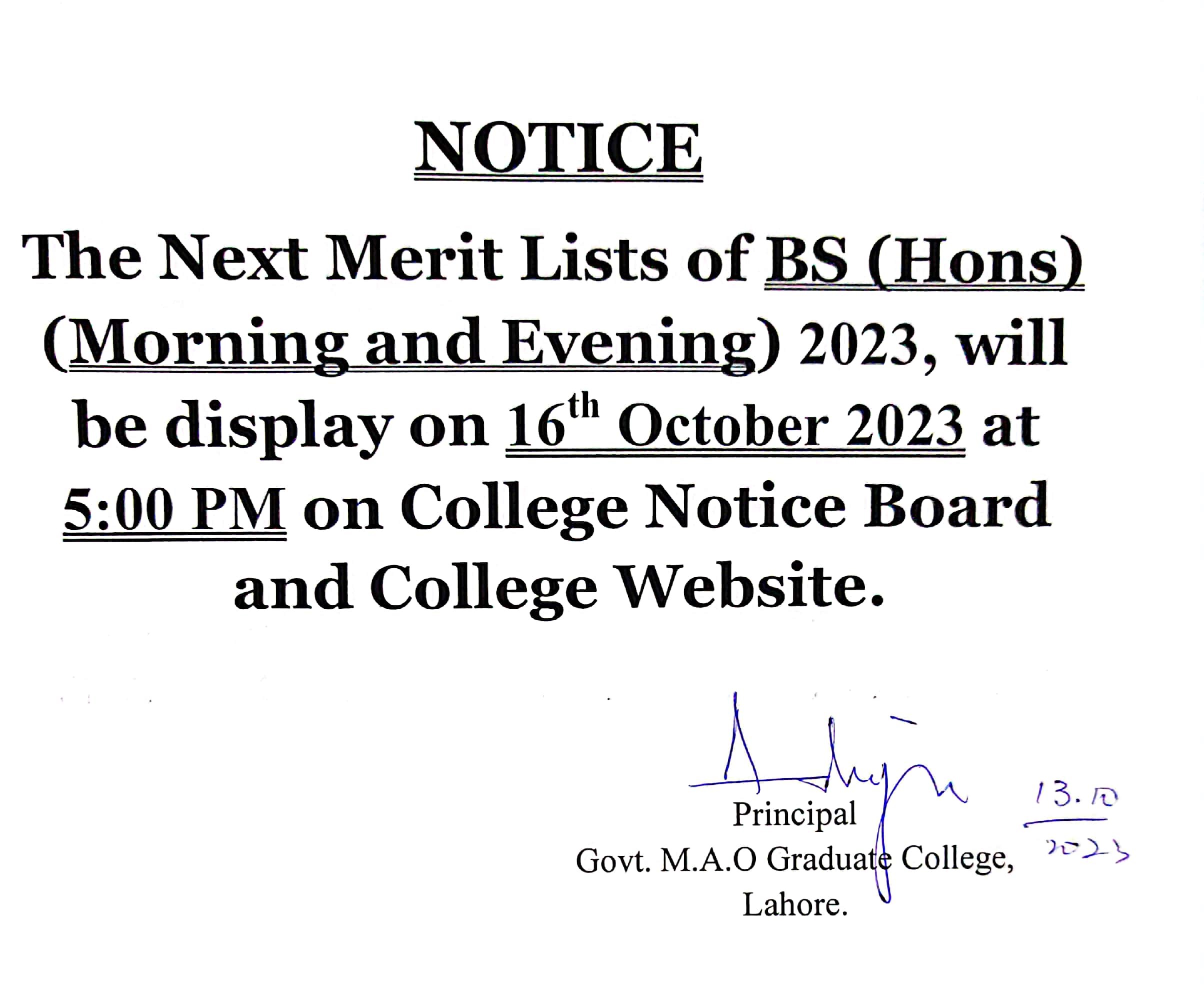 Notice Regarding Merit Lists of BS (Hons) Morning & Evening 2023