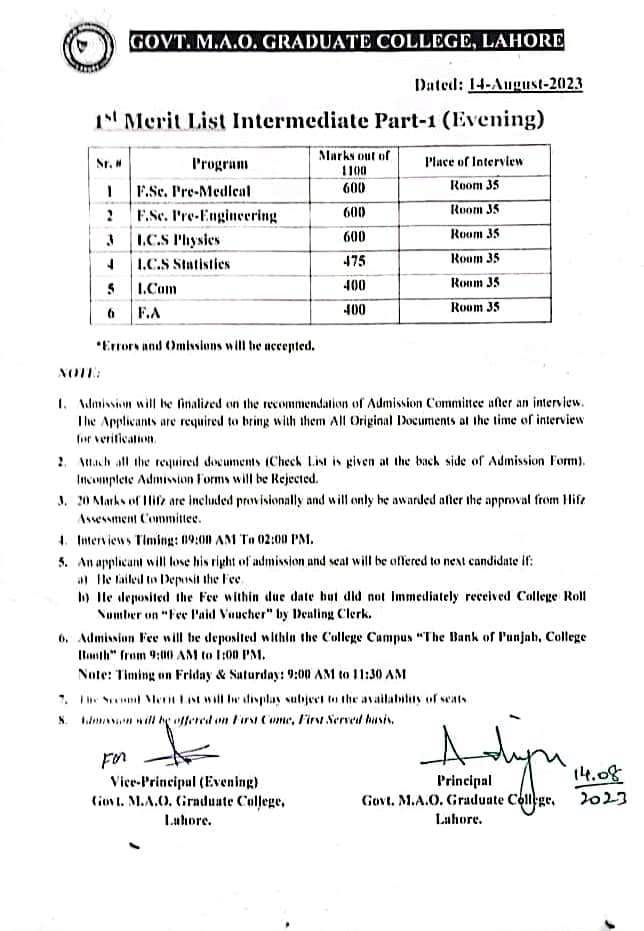 1st Merit List of Intermediate Part-I (Evening) 2023